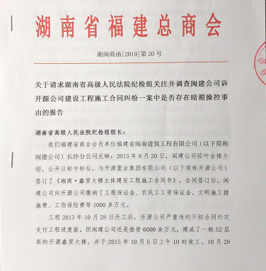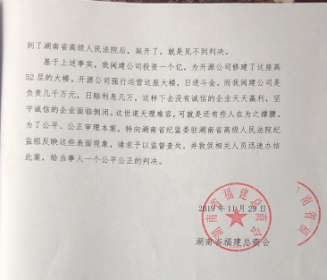 2019年11月29日,闽南工程公司的案件引起了湖南省福建总商会的高度关注。在致湖南省高院纪检组的一份报告中,提到了一件令人匪夷所思的事: