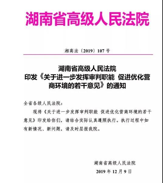 2019年12月19日,湖南高院召开新闻发布会,通报近两年全省人民法院民营经济司法保护情况,发布《湖南省高级人民法院关于更好发挥审判职能作用促进优化营商环境的若干意见》(以下简称《意见》)。